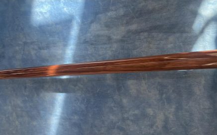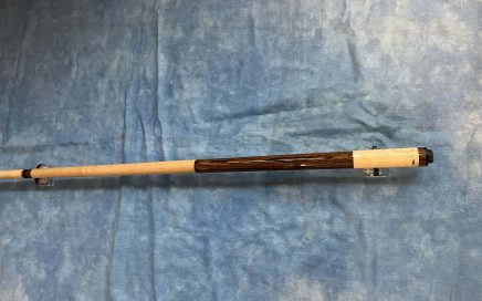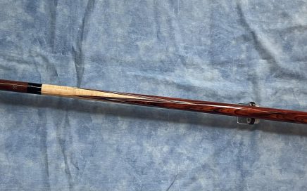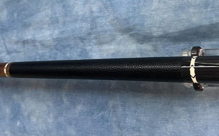 Butt: forearm makassar Eb./ Buttsleeve Pu. length 29.2 inches / 21.4 – 31.5 mm e.d. Shaft: MW Carbon shaft length 30 inches 21.35 – 12.3 mm e.d. 10 inlays/ 5 point & 5 triagle / Purpleheart Leather shark Print sold/Verkauft